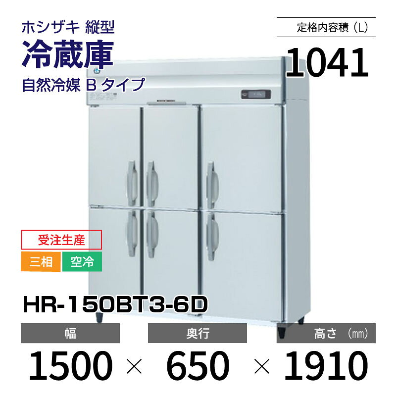 搬入設置も承りますのでお気軽にメールまたは055-920-8008へお電話下さい。仕様【状態】 新品【メーカー】 ホシザキ【商品名】 縦型 冷蔵庫 自然冷媒 Bタイプ【型式】 HR-150BT3-6D【主な特長】 ・インバーター制御・多層クリアコートステンレス・空冷式【定格内容積】 1041L【外形寸法】 幅 1500 ×奥行 650 (〜 1191) ×高さ 1910 (mm)【庫内温度】 -6